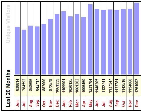 | In het jaar 2009 zette de stijging van het aantal bezoekers door: de site werd 13,5 miljoen keer bekeken, oftewel ruim 1,128.000 keer per maand. December 2009 werd een nieuwe recordmaand: dik 1, 260 miljoen unieke bezoekers ! De afgelopen week lag het aantal dagelijkse bezoekers gemiddeld op meer dan 50.0000. |