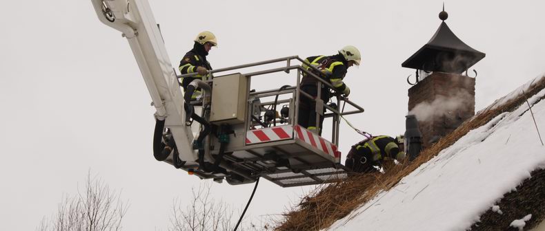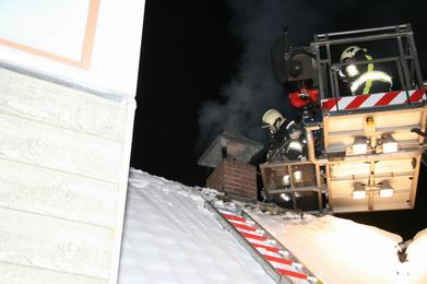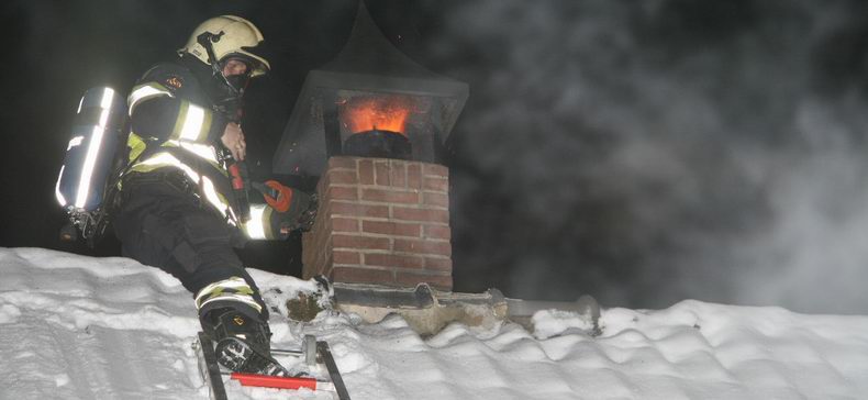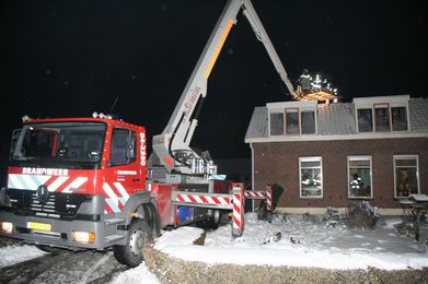 | Bij aankomst sloegen de vlammen uit de schoorsteen en werd eerst met een ladder de schoorsteen bekeken in afwachting van de hoogwerker. Met behulp van het hoogtevoertuig uit Hardenberg werd de schoorsteen geveegd. |