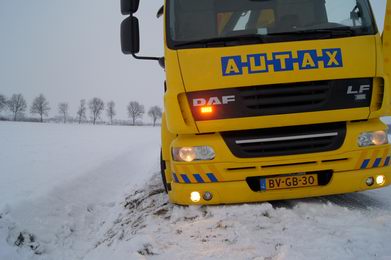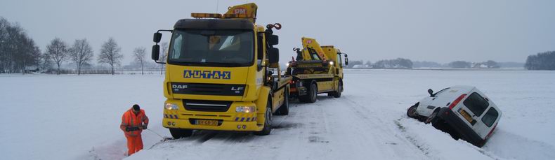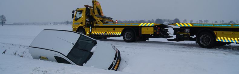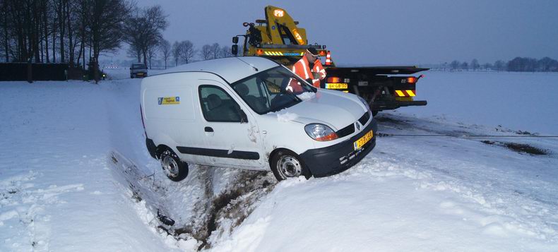 | Een postbezorger gleed vanmidag met z'n leenauto van de door aangereden sneeuw spekgladde Kattendijk de bermsloot in. Het ging gelukkig niet hard: de man bleef ongedeerd en de schade aan de bestelauto bleef binnen de perken. Maar toen berger Klaas de auto uit de sloot wilde takelen, bleek de gladheid andermaal een hindernis: de bergingsauto gleed eveneens weg en dreigde aan de andere kant van de weg in de bermsloot te belanden. Daarop werd een tweede bergingswagen opgetrommeld, die na enig manoeuvreren en met behulp van de kraan de eerste autoambulance weer op een veiliger plek wist te krijgen. |