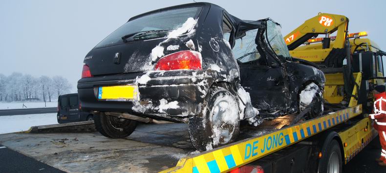 | Berger de Jong haalde de drie voertuigen op en kreeg daarbij hulp van politiemensen, die hielpen bij het uit de zachte middenberm duwen van twee voertuigen. Hoe zwaar de schade aan de Peugeot was, bleek pas, toen de auto uit de sloot werd getakeld. Hoe de aanrijding kon ontstaan is onderdeel van het onderzoek door verkeersongevalsanalisten, dat ter plaatse gestart werd. Het verkeer ondervond weinig last van de nasleep van de aanrijding. |