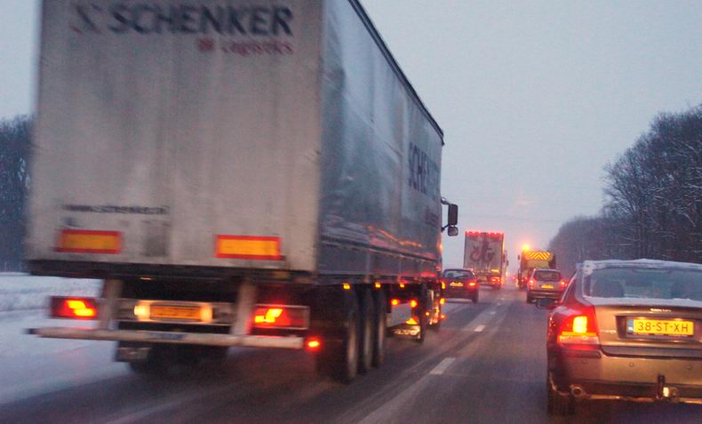 | Links bleef men achter de sneeuwschuiver, die steevast 43 km/uur reed. Desondanks stoven even voor vijf uur opeens drie vrachtwagens met oplegger met tegen de negentig km/uur over de dikke laag sneeuw langs de langzaam rijdende file. Let op de onderlinge afstand: wat gebeurt er, als de voorste combinatie opeens moet remmen, laat zich raden. |