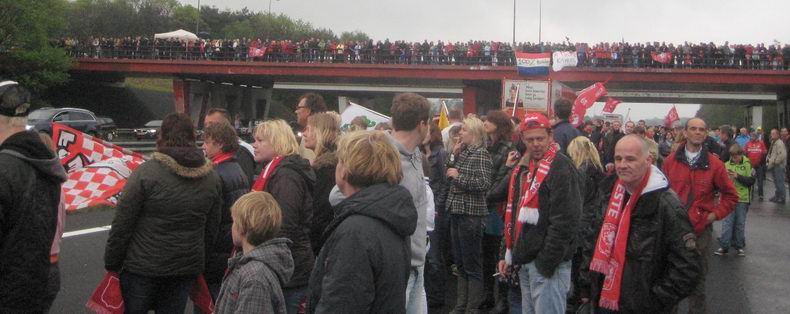| Het kampioenschap van FC Twente leidde gisteren tot chaotische taferelen, onder meer op de snelwegen A1 en A35, die plaatselijk volstroom-den met supporters, die zelfs in groten getale op de rijbanen liepen. De politie adviseerde, niet naar de binnenstad van Enschede te gaan, waar al zo'n 45.000 mensen feest vierden, maar uiteraard ook van de snelwegen af te blijven, omdat dat tot levensgevaarlijke situaties leidde. Onderstaande foto's zijn genomen op de A1 bij Markelo. |