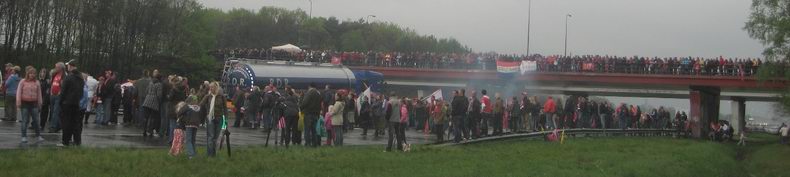 | Wie denkt, dat het leven van een Kilroy-medewerker alleen maar bestaat uit het vergaren van nieuwsfoto's, heeft maar gedeeltelijk gelijk. Maar ook als je onderweg bent naar een adverteerder, die in Kleef, dus ver buiten het werkgebied van de site gevestigd is, ligt de camera altijd klaar. Zo ook vandaag, toen de fotograaf rond half vier onverwacht in een file op de A50 belandde, ongeveer ter hoogte van Schaarsbergen. Er bleken een tankwagen en een Renault Espace personenauto van de rijbaan richting Arnhem te zijn geraakt en tegen de middenvangrail tot stilstand gekomen. Aangezien de rij auto's nog niet zo lang was, lijkt het ongeval met de personenauto en de tankwagen, die naar verluidt varkensvet als lading had, nog "vers". Er zouden geen gewonden zijn gevallen, hetgeen een wonder moge heten. De file groeide uit tot zestien kilometer en op de rijbaan richting Apeldoorn tot vijf kilometer. De oorzaak van het ongeval is nog niet bekend. Wel is duidelijk, dat er ter plaatse een inhaalverbod geldt voor vrachtwagens. |