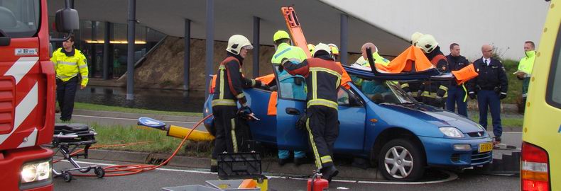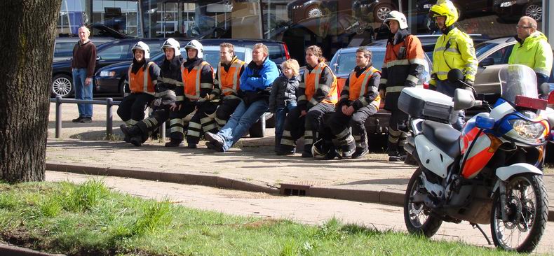 | Desalniettemin begon men ijverig met de inzet, die beoogde, een aantal gewonden van een fictief "enstig verkeersongeval" tussen twee auto's en meerdere fietsers in veiligheid te brengen. DIt alles gebeurde met medewerking van leden van LOTUS* (Landelijke Organisatie Tot Uitbeelding van Slachtoffers) en EHBO'ers. Er was ondanks de geringe publiciteit toch veel publiek naar de "ongevalslokatie" gekomen. Helaas moest bevelvoerder Harry Smit na afloop van de show mededelen, dat het geplande bezoek van de traumaheli vanwege slecht weer (mist in Groningen) niet door kon gaan, hetgeen voor velen een echte teleurstelling bleek te zijn. * Zie voor meer informatie: http://www.organisatielotus.nl/ |