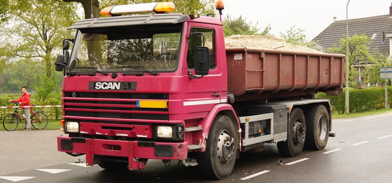 | De met zand geladen vrachtwagen liep over de volle lengte van de linker zijkant schade op. |