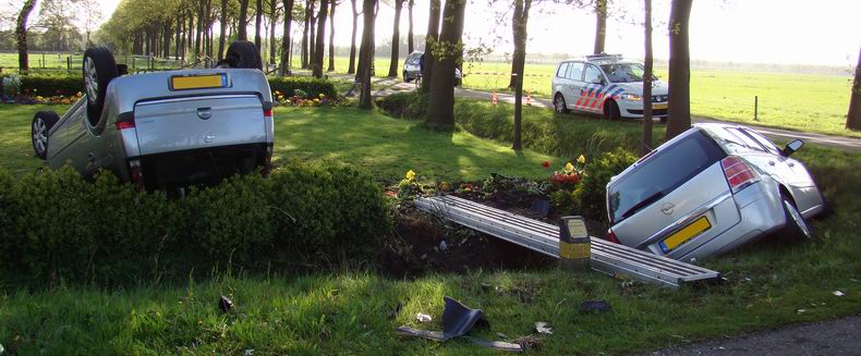 | De Opel Zafira kwam op zijn kant in de sloot van de tuin terecht. Deze betuurder is in de ambulance onderzocht. Het is niet bekend, of hij later naar een ziekenhuis is vervoerd. De wrakken van de Opels werden opgehaald door berger Leerentveld. |