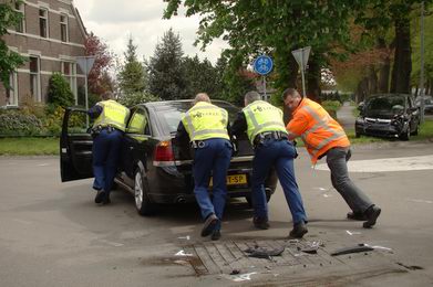 Hoewel de vrouw, die de afslaande auto bestuurde, voorrang had moeten verlenen, bleek uit de remproef met de Ford Fiesta, dat die waar-schijnlijk aanzienlijk harder heeft gereden dan de 50 km/uur, die ter plaatse als limiet geldt. Beide -zwaar beschadigde- auto's werden door berger De Jong opgehaald. |