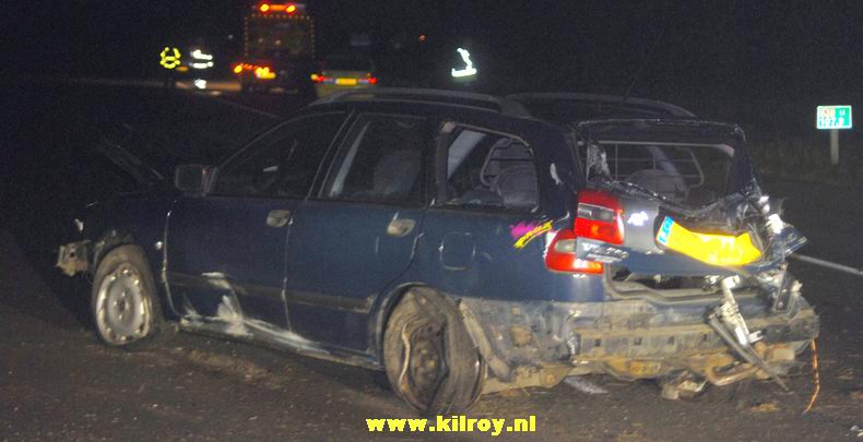 | Even ten oosten van de ongevalsplek botste trouwens een Opel personen achter op een voor de kruising wachtende merkgenoot model Vectra. De voorste auto kon na afhandeling van de administratieve afhandeling verder rijden; de achterste werd door berger De Jong opgehaald. Ook de twee beschadigde auto's werden door dit bedrijf van de kruising verwijderd. |