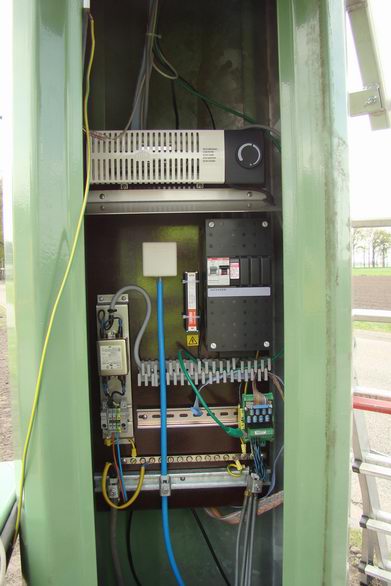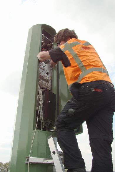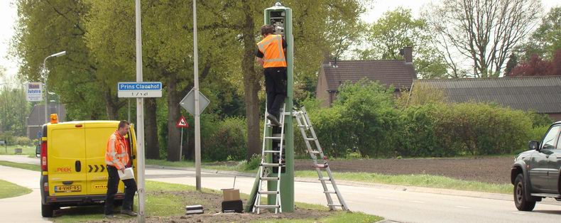 | Op weg door Hollandscheveld ontdekten we, dat twee personeeldleden van de firma Peek Traffic aan het werk waren met de FIP (flitspaal), die recentelijk aan de Riegshoogtendijk -ter hoogte van het Prins Claushof- is neergezet. Hoewel de apparatuur al compleet was, moest er nog een en ander afgeregeld worden, zoals de juiste stand van de camera. |