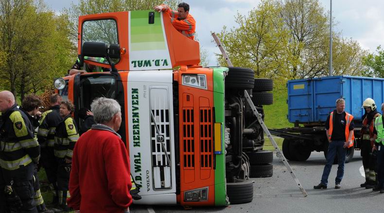 | Een met oud betonijzer geladen vrachtwagen is maandagmiddag rond 13:15 gekanteld op de rotonde in de Noorderweg bij Marum.