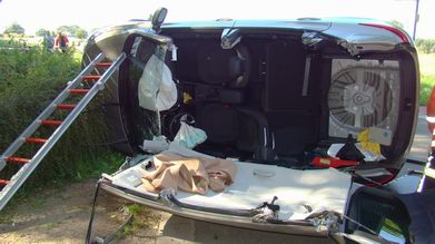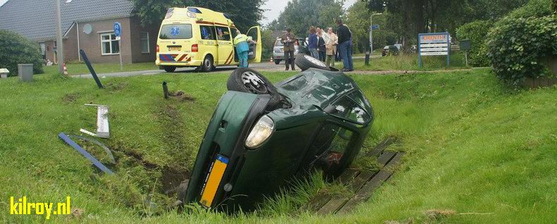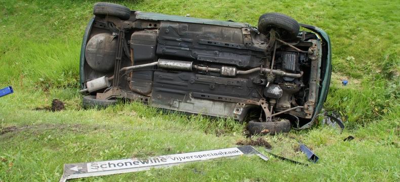 | Een automobilist is zaterdagmiddag van de A28 bij Beilen beraakt en in een bermsloot beland, nadat de auto meerdere keren over de kop was gegaan. De bestuurder werd naar een ziekenhuis overgebracht. Gelukkig zat er niemand achter in de auto, want dit deel van het voertuig was geheel ingedeukt door het ongeval. |