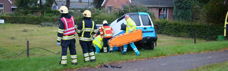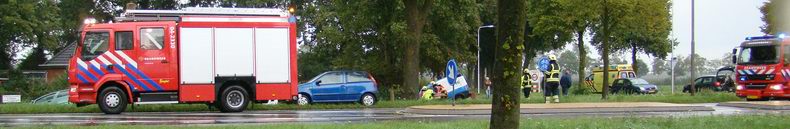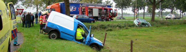 | De hulp van de Hardenberger brandweer werd vrijdagmiddag om 16:22 uur ingeroepen, nadat zich op de Jachthuisweg een kop-staart-aanrijding had voorgedaan tussen een Fiat Punto en een Opel Combo bedrijfsauto,bestuurd door een twintig inwoner van Lutten. De uit Hoogeveen afkomstige Fiatbestuurster (26) reed op de Jachthuisweg richting Slagharen, maar had te laat in de gaten, dat de bedrijfsauto afremde om rechtsaf te slaan naar de Middenweg. Na de aanrijding kwamen beide auto's in de oostelijke bermsloot bij boerderij Vader's Erf terecht. De Hoogeveense bleef ongedeerd, maar de bestuurder van de bedrijfsauto werd uit voorzorg door brandweer- en ambulancepersoneel uit zijn auto geholpen. Hij is voor onderzoek per ambulance naar een ziekenhuis vervoerd. |