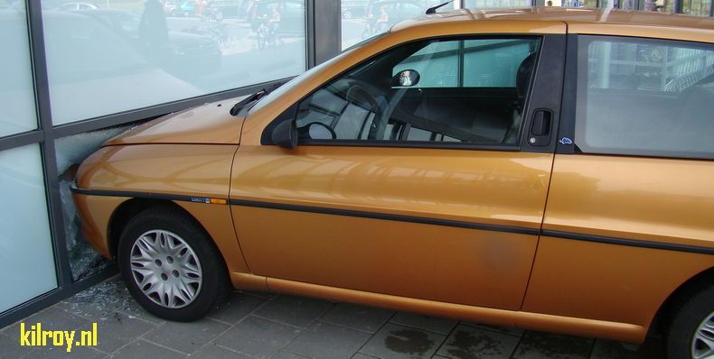 | De bestuurster, die naar verluidt ergens van schrok, is abusievelijk vooruit gereden, over een stopblok en door een gevelruit. Ze raakte niet gewond. De auto werd door berger Klaas van de firma Autax weggesleept. Tijdens de afhandeling van de aanrijding ging de verkoop in de supermarkt gewoon door. De politie heeft het voorval op papier gezet, zodat de zaak nu verder een kwestie is voor de verzekeringsexperts en de glaszetter. |