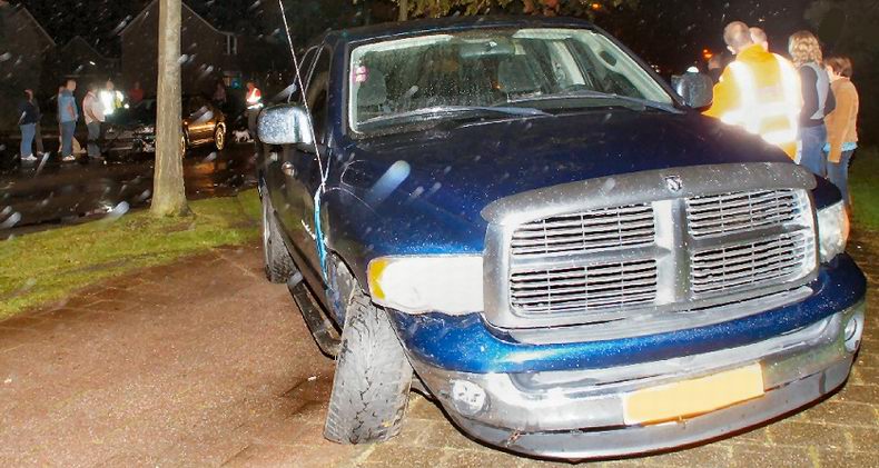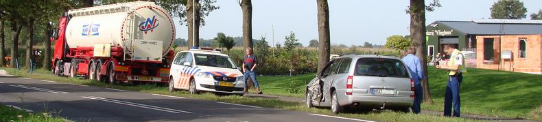 | De uit de buurt van Bremerhaven (D) afkomstige bestuurster van een Opel personenauto kreeg flinke schrik te verwerken, toen ze zaterdag-morgen van de Europaweg in de buurtschap Vlieghuis (tussen Schoonebeek en Coevorden) naar links wilde afslaan. De vrouw reed langzaam, omdat ze niet precies wist, welke inrit naar het erf van een boerderij ze in moest rijden, waarop een achterop komende (Duitse) bestuurder van een Nederlandse vrachtwagen de auto in wilde halen. De vrouw, die plotseling in haar linker achteruitkijkspiegel het gevaarte zag opdoemen, wist haar auto nog tot stilstand te krijgen, maar de voorzijde van de trekker raakte toch nog de linker zijkant van de Opel, die daardoor zwaar beschadigd werd. Ook de trekker liep schade op. Beide bestuurders, alsmede de in Emlichheim wonende vriend van de Opel-bestuurster, die als passagier meereed, bleven ongedeerd. De personenauto moest door berger De Jong worden weggesleept; de vrachtwagen kon op eigen kracht verder. |