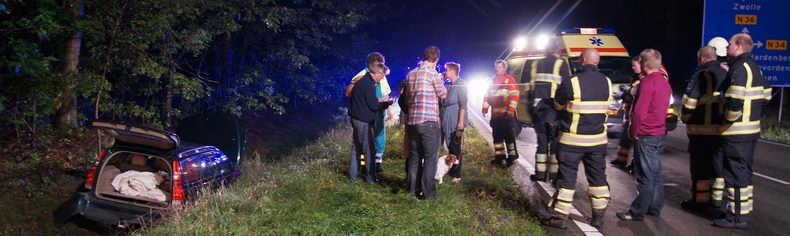 | Het was behoorlijk schrikken voor de echtgenoot van de bestuurster van een Volvo V70, toen die auto even voor 21:00 uur op circa 600 meter voor de nieuwe rotonde bij de Witte Paal onverwachts naar links afweek en nog zo'n 80 meter door de droge bermsloot aan de westzijde van de N36 ploegde, voordat hij tot stilstand kwam. Al snel werd duidelijk, dat de vrouw onwel was geworden, waarop politie, ambulance en brandweer werden ingeschakeld. Ook voor het hondje van het echtpaar bleek het een angstaanjagende belevenis te zijn geweest: het diertje was behoorlijk van streek. |