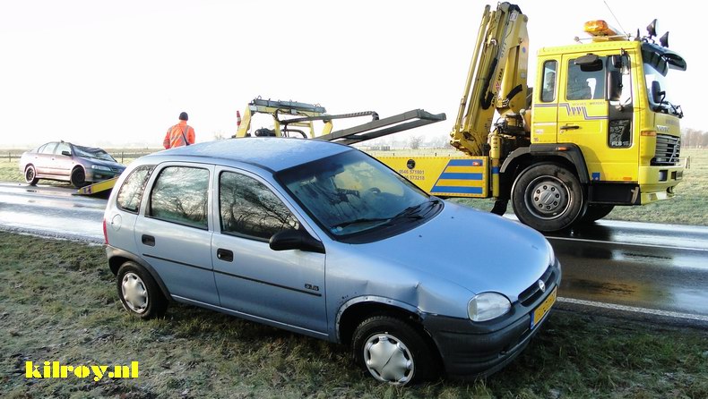 | Ook vanmorgen werden diverse automobilisten onaangenaam verrast door plaatselijke gladheid. Op de doorgaande wegen was al vroeg gestrooid, maar secundaire routes en straten in woonwijken bleken vaak zelfs halverwege de ochtend nog onverwacht spiegelglad. Op de Bouwmeesterstraat ( Westerhaar-Vriezenveen) raakten nabij de kruising met de Veeneindeweg twee auto's -los van elkaar- door glijpartijen beschadigd. Eén van de twee -een Nissan Primera, die richting Vriezenveen reed- kwam ondersteboven in een bermsloot tot stilstand. Gelukkig bleef het (voor zover bekend) bij licht letsel, maar de twaalf jaar oude, met winterbanden uitgeruste Nissan was rijp voor de sloop. De auto's werden opgehaald door berger Wolves. |