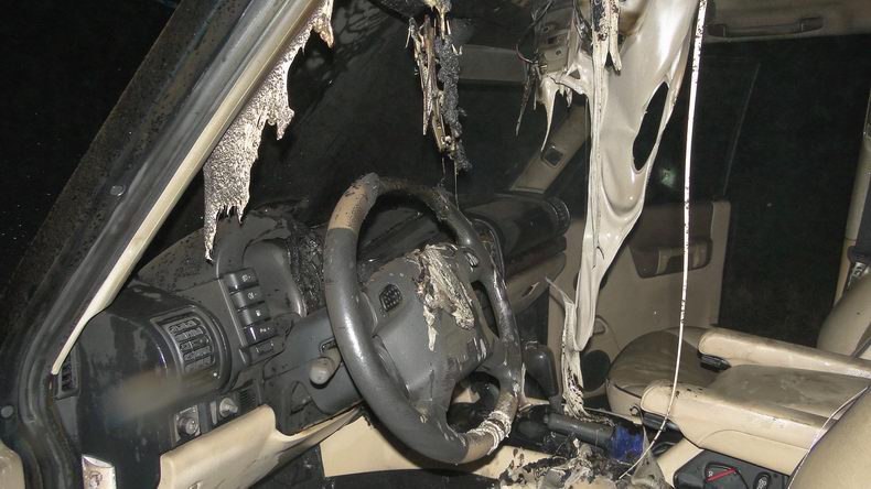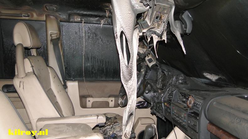 | De man kon nog op tijd uit de auto komen, maar moest vervolgens lijdzaam toezien, hoe het interieur van de drie maanden geleden aangeschaf-te auto een prooi van de vlammen werd. De Gramsberger brandweer wist te voorkomen, dat het in 2003 gebouwde voertuig volledig uitbrandde, maar de Landrover was desalniettemin verzekeringstechnnisch niet meer te herstellen. Berger Autax vervoerde de auto naar een in Landrover- en Rangerover-onderdelen gespecialiseerd bedrijf in Coevorden en bracht de eiganaar vervolgens thuis. |