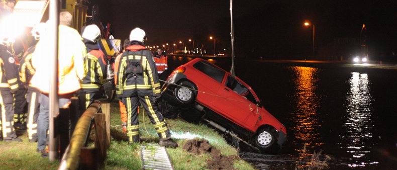 | Vrijdagavond tegen kwart voor elf werd gemeld, dat er een auto te water was geraakt aan de N36 ter hoogte van de afslag Aadorpsweg. Alleen de kofferbak stak nog boven water uit. De 31-jarige bestuurder uit Wierden is met onderkoelingsverschijnselen per ambulance naar een ziekenhuis Een blaastest wees uit, dat de man teveel alcohol had genuttigd. Zijn rijbewijs en het kentekenbewijs van de auto zijn ingevorderd. De veertien jaar oude auto was rijp voor de sloop. Berger Wolves lierde de auto met hulp van een brandweerduiker uit de plomp. |