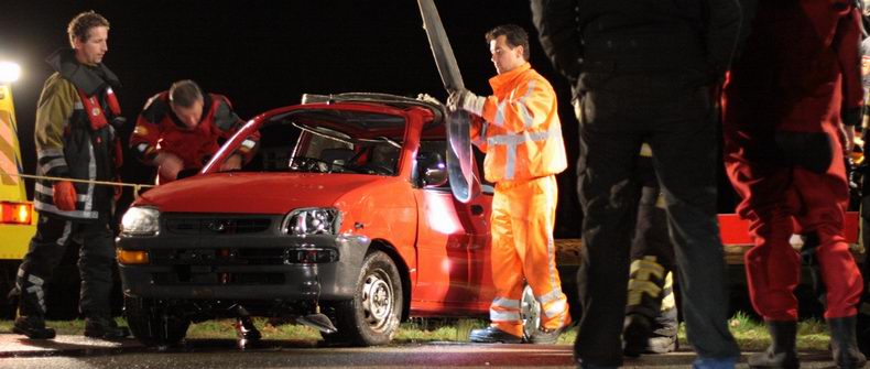 | Om de gewonde zo voorzichtig mogelijk in veiligheid te brengen, knipte de brandweer de B-stijl met beide portieren aan de bestuurderszijde van de zes jaar oude Toyota weg. De twee inzittenden van de VW bleven -naar verluidt- ongedeerd. De aanrijding werd onderzocht door een verkeersongevallenanalist. Beide auto's werden weggebracht door berger Koolen. |