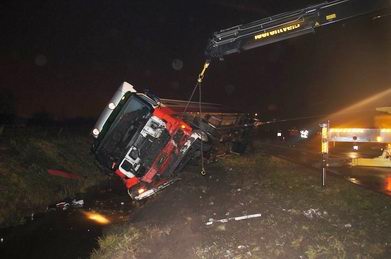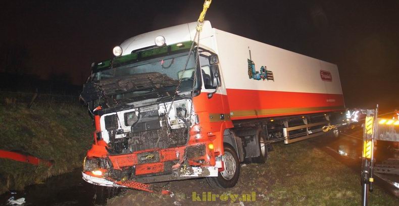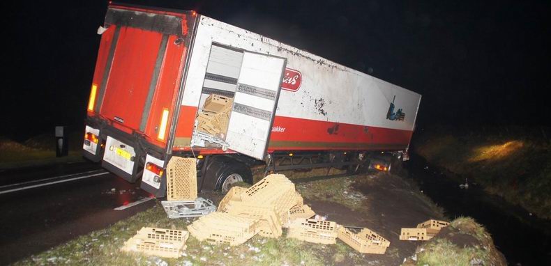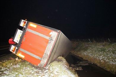 | In de nacht van maandag op dinsdag is tegen vier uur een trekker met oplegger van een bakkerij tijdens een fikse sneeuwbui geslipt en van de N331 (Werkerlaan) tussen Zwolse-Stadshagen en Hasselt geraakt. De vrachtwagencombinatie belandde via de berm op zijn kant in een sloot. De chauffeur, die door de cabine was geslingerd, liep licht letsel (kneuzingen) op. De truck was total loss. De oplegger was geladen met kratten vol vers brood, bestemd voor een Zwolse C1000-supermarkt, die nu zonder zit. Berger Leerentveld wist de combinatie zonder al te veel problemen op de wielen te krijgen en, nadat de berm gerepareerd was, kon het verkeer vanaf circa half negen weer van de weg gebruik maken. |