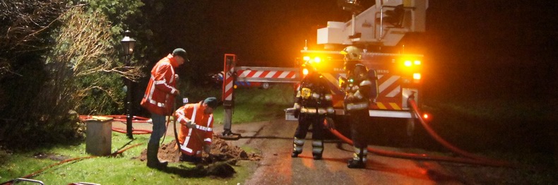 | De brandweer had handenvol werk aan de gevolgen van een gesprongen hoofdwaterleiding aan de Boermarkerweg in Hooghalen. De enorme hoeveelheid drinkwater zette niet alleen het erf van een boerderij onder water, maar stroomde ook een er naast staande, lager gelegen rietgedekte woning binnen en richtte daar zware schade aan. |