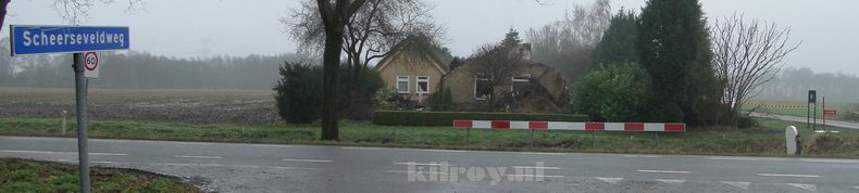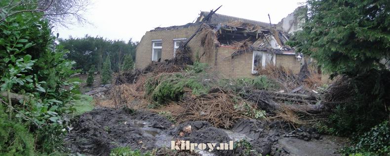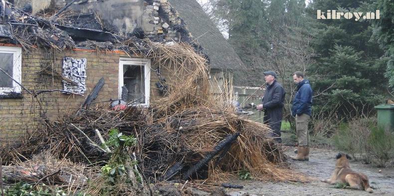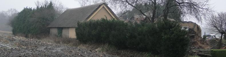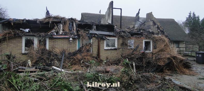 | In de loop van de nacht waren de muren en het dak met een graafmachine bewerkt om het bluswerk te bespoedigen, maar er werd tegen het middaguur toch weer om de komst van een blusgroep verzocht, omdat het riet opnieuw smeulde. (foto 4) Wel werd bij daglicht duidelijk, dat de brandweer een (eveneens rietgedekt) bijgebouw heeft kunnen behouden. |