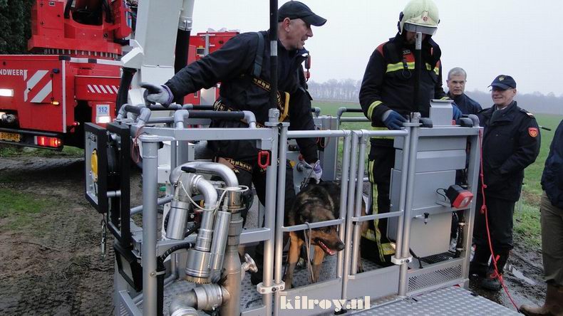| Het was de eerste keer, dat er een dierlijke passagier in de hoogwerker omhoog ging. |
