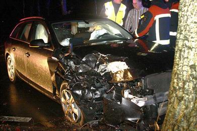 | Schoobeek: auto breekt in stukken na crash tegen boom |