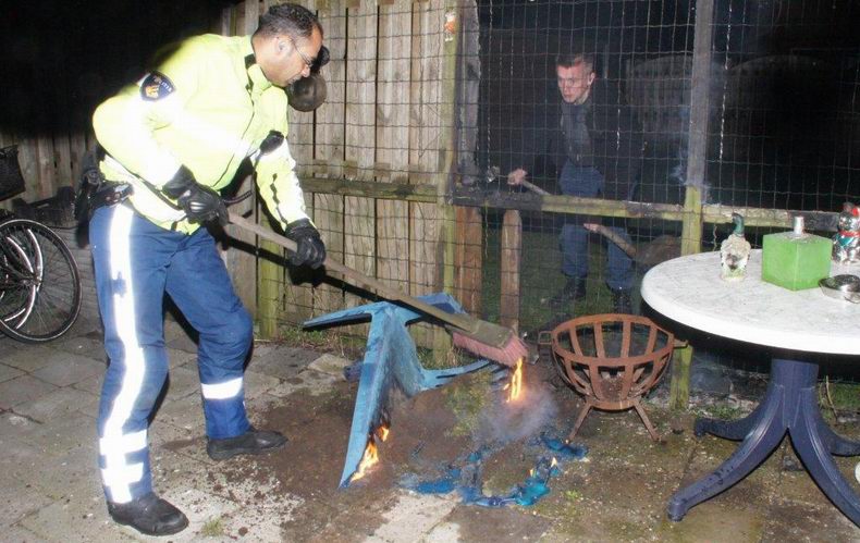Een motoragent, die inmiddels was gearriveerd, nam het initiatief. Hij vroeg om blusmateriaal en kreeg een grote gieter.