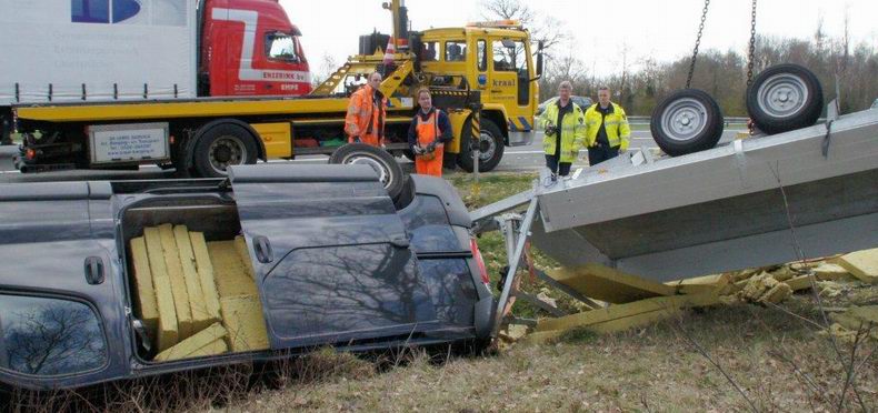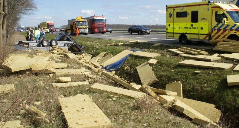 | De lading uit de aanhanger -platen isolatiemateriaal- lag over enkele tientallen meters verspreid rond de plaats van het ongeval. De VOA onderzocht de zaak op technische mankementen. |
