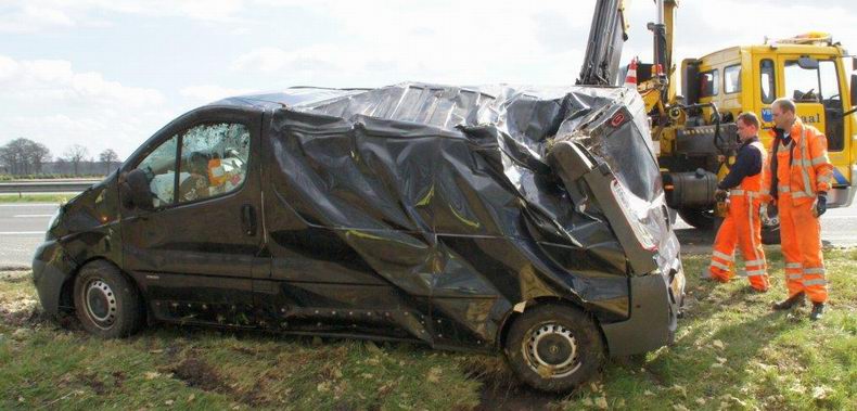 Getuigen en een groepje militairen, die voorbij kwamen, haalden de inzittenden -een vader en zoon uit Zwolle- uit de auto. De twee kwamen er zonder noemenswaardige verwondingen vanaf, maar gingen voor nader onderzoek naar het ziekenhuis. Getuigen gaven aan, dat het ongeval was veroorzaakt door de zuiging van een passerende vrachtwagen. |