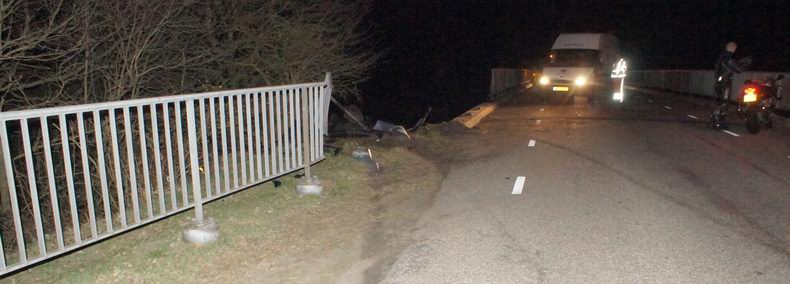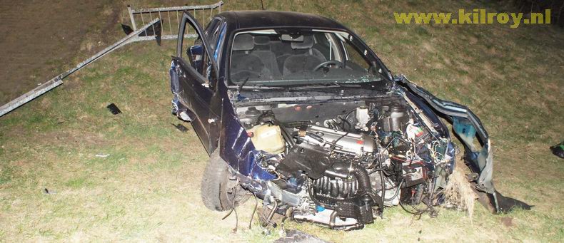 | Dat mislukte jammerlijk : de auto slipte, crashte dwars door de leuning aan de linkerzijde van de brug en stortte een meter of tien van het talud. Dat gebeurde met zoveel geweld, dat de leuningen van hun dikke betonnen sokkels gerukt werden en voor een flink deel met de C5 de diepte in werden gesleurd. Wonder boven wonder kwam de bestuurder er met wat lichte verwondingen vanaf. ZIjn auto was zonder enige twijfel rijp voor de sloop, hoewel er niet veel bruikbare onderdelen meer aan te ontdekken waren.... Berger De Jonge haalde het wrak en de talloze restanten op. |