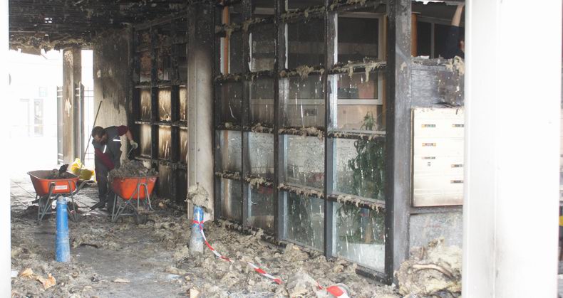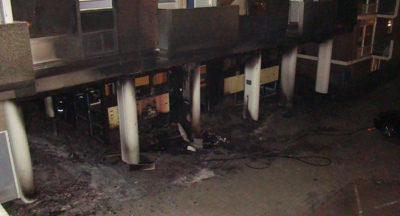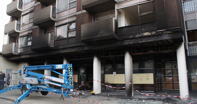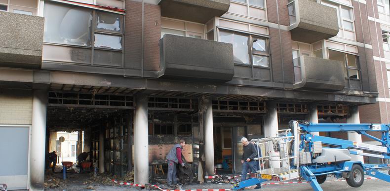 | Vijdagmorgen na het politie-onderzoek werd er al met man en macht gewerkt om de schade, die de grote brand de afgelopen nacht aanrichtte aan de flat aan het Kloosterhofpad, te repareren en de boel schoon te maken. De volledige herstel- en reinigingsoperatie zal naar verwachting nog geruime tijd in beslag nemen. Over de exacte oorzaak van de brand tast men nog in het duister, maar brandstichting lijkt het meest aannemelijk. |