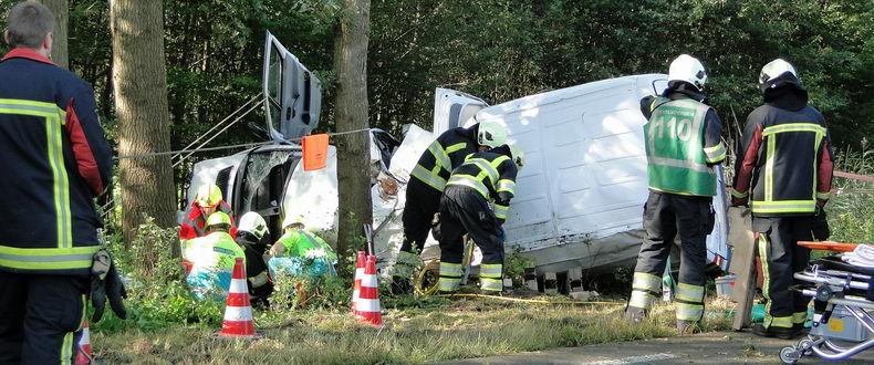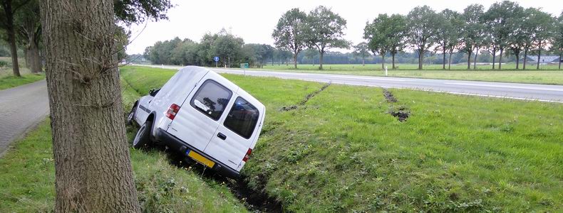 | Maandagmorgen is een bestelautobestuurder in een langdurige reddingsoperatie uit het wrak van zijn voertuig bevrijd na een aanrijding op de N375 (Pesse - Meppel). De man reed vlak voor het ongeval in de richting van Meppel, toen zijn bedrijfsauto met het rechter voorwiel tegen het maaimechanisme van een tractor botste, die net op dat moment iets de weg opdraaide. De velg werd daardoor vernield, de auto raakte onbestuurbaar en kantelde de rechter berm in, waarbij enkele bomen en boomstronken geraakt werden. De bus, die een grote hoeveelheid kantoorbenodigdheden vervoerde, kwam op zijn linkerkant in de berm tot stilstand. |
