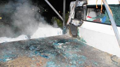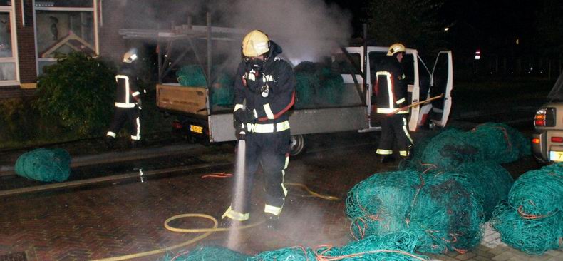 Voordat de brandweer arriveerde laaaiden de vlammen al metershoog op en smolten de netten aan elkaar. Het was dan ook lastig, de samengesmolten klomp netten uit de laadbak te halen. De smeulende resten werden met schuim afgedekt. De vlammen waren ook achterin de personencabine doorgedrongen. Berger Kraal heeft de Ford afgevoerd naar de opslag, waar nader onderzoek door de politie zal plaatsvinden. |