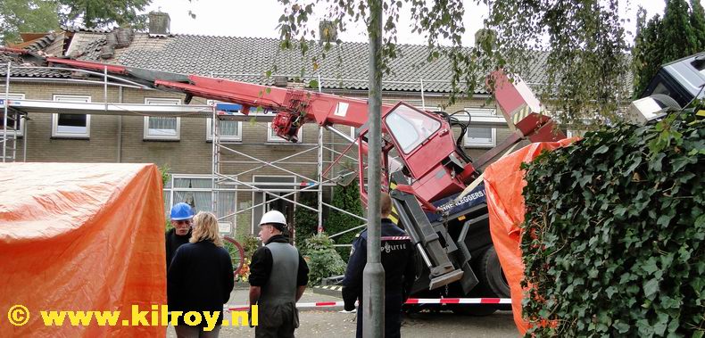 | Een 45-jarige man uit Meppel is dinsdagmorgen om het leven gekomen, toen een dakenleggerskraanwagen van een pannenleggersbedrijf kantelde tijdens dakwerkzaamheden aan een rij (bewoonde) woningen aan de Weidebocht in Heerde. De tonnen zware giek viel boven op een hoekwoning en sloeg een groot gat in het dak en in de zijmuur van de hoekwoning. De lange uitschuifbare stalen mast kwam tot stilstand op de vloer van de zolderverdieping en in een grote berk aan de Dürst Brittlaan. Het slachtoffer, dat samen met een collega op het dak aan het werk was met de vanaf het dak op afstand bestuurde kraan, overleed ter plaatse; de andere man overleefde het voorval. |