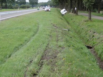 | Opmerkelijk detail: de motor van de Kia, die op zijn linker zij tot stilstand kwam, bleef na de botsing doorlopen; ook, toen het contactsleuteltje omgedraaid was. Pas toen de auto teruggekanteld was naar ca 45 graden liep het toerental terug en na enige tijd stopte de motor spontaan. |