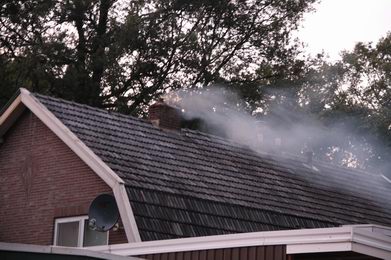 | De brandweer had er een hele klus aan, het vuur in het rookkanaal te doven. Zo had een combinatie van blussen met CO2 en vegen in het begin weinig effect: h Bovendien kwam er brandend materiaal naar beneden, dus bij de opening beneden was ook vuur waargenomen. De brandweer ging rond half elf retour kazerne. |