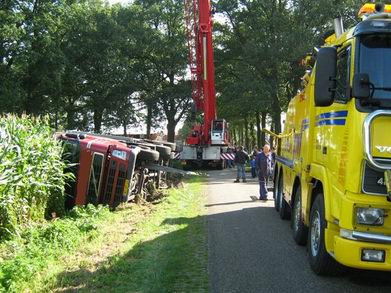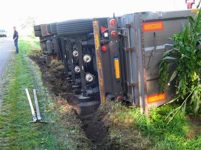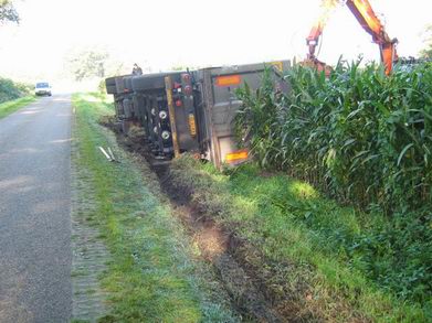 Omdat op de kruising met de Delenweg een aanhanger in de berm geparkeerd was, moest de trucker iets door de berm om het obstakel te passeren. Doordat de bermen door de regenval van de laatste weken nogal nat en zacht zijn, zakte de truck weg in de berm en kantelde. De chauffeur kwam met de schrik vrij.