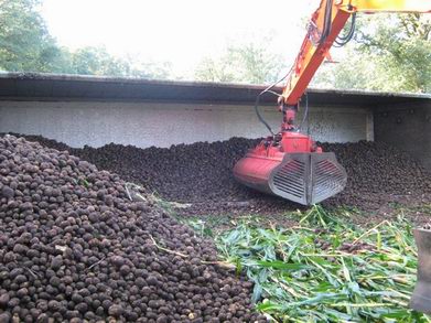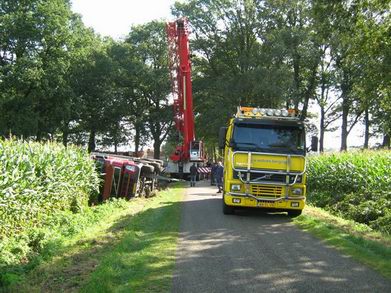 Nadat een kraan de aardappelen uit de trailer had gelost, kon berger Wolves in samenwerking met een 100 tons kraan van de fa. Wagenborg de truck weer op zijn wielen zetten. |