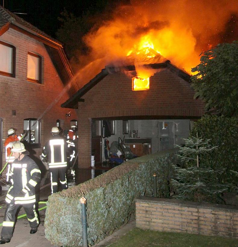 | Brand in een garage bij een woning aan de Friedhofsweg in Hoogstede heeft in de nacht van donderdag op vrijdag voor ca 70.000 Euro aan schade aangericht. De vrijwillige brandweer van Hoogstede werd om ca 00:38 uur gealarmeerd en rukte met vier voertuigen en 25 man uit. Men wist de brand, die zich al over het gehele dak had verspreid, snel onder controle te krijgen, zodat de vlammen niet op de aangrenzende woning konden overslaan. Er zijn geen gewonden gevallen. De politie stelt een onderzoek in naar de oorzaak. |