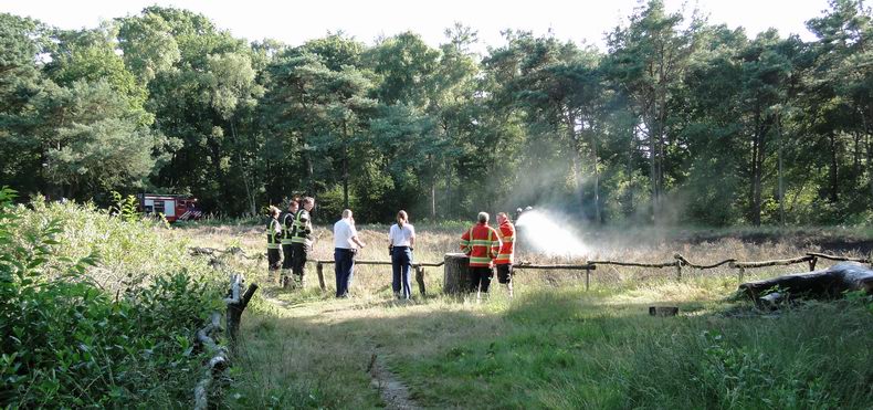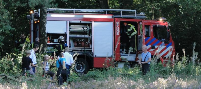 | De rook, die boven de bomen van het omringende bosperceel uit steeg en op afstand al te zien was, wees de spuitgasten de weg. Door snel ingrijpen en het leegspuiten van een volle TAS-tank kon men voorkomen, dat het bos vlam vatte. Een gebied van ca 2000 vierkante meter heide brandde kaal, maar de bijenkasten, die in de onmiddellijke omgeving stonden, konden behouden worden. Het was trouwens de tweede keer binnen vier dagen, dat de brandweer naar deze plek uitrukte. Vrijdag om 17:30 uur moest de brandweer van Hardenberg ook al naar De Riet; toen diende er een smeulend kampvuurtje bij het heideveldje gedoofd te worden. Toen volstond een emmer water... |