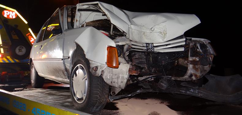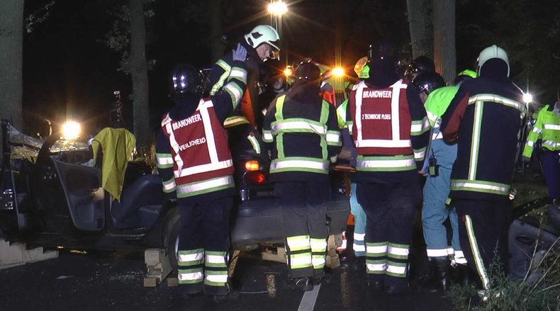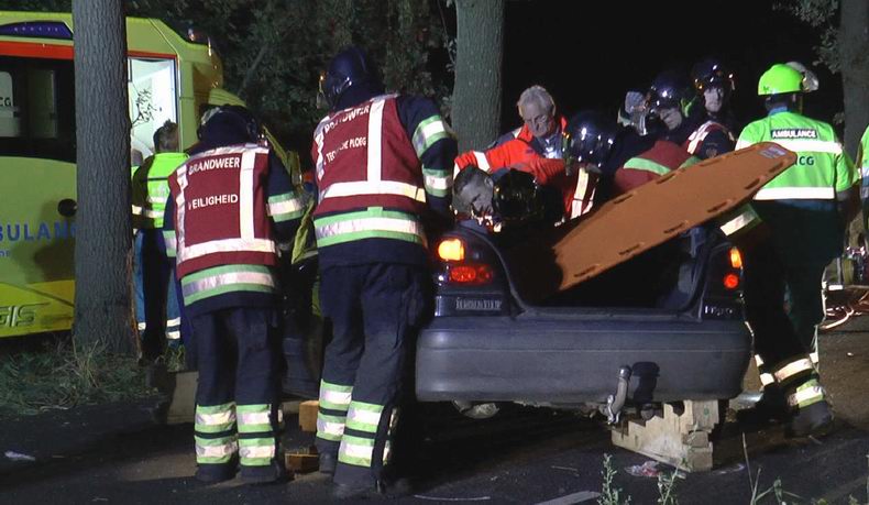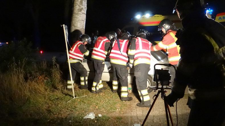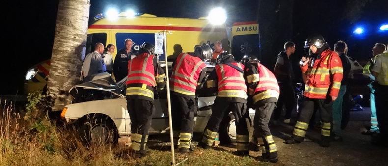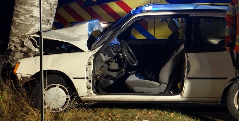 | Vrijdagavond rond elf uur kwamen de pagers van de Hardenberger brandweer tot leven met de mededeling, dat er er de Rheezerveenseweg een "ongeval letsel" gebeurd was. De brandweer was extra snel ter plaatse, omdat de mannen al in de kazerne aanwezig waren vanwege een feestelijke bijeenkomst. Men trof op de aangegeven plaats (ter hoogte van huisnummer 28) een Peugeot 205 aan, die in een vrij scherpe bocht naar rechts rechtdoor was gegaan en daarbij frontaal op een dikke berk geklapt was. De gewonde bestuurder, die kennelijk onzacht met het stuur in aanraking was gekomen, zat nog in het wrak en werd door de brandweer in veiligheid gebracht. Hiertoe werd het linker portier weggeknipt. Nadat de jonge man per ambulance weggebracht was, kon berger Autax de restanten van de 22 jaar oude Peugeot 205 XRD 1.8 opruimen. |