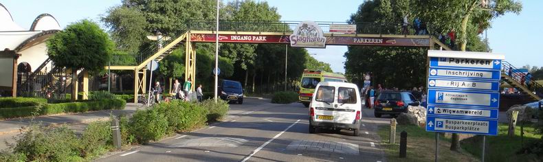 | In het begin van de zaterdagavond is een overstekende vrouw gewond geraakt, toen ze de Zwarte Dijk van de entree van het Attractiepark naar de parkeerplaatsen overstak en niet in de gaten had, dat er uit de richting van Slagharen een auto naderde. De vrouw werd geschept en liep daardoor letsel op. Haar drie kinderen, die samen met een tante wel via de voetgangersbrug overstaken, waren hevig ontdaan door het voorval. Het gewonde slachtoffer werd per ambulance naar een ziekenhuis vervoerd; de kinderen konden met een tweede ambulance mee. Volgens de geruchtenmachine zou de bestuurster van de personenauto na de aanrijding zijn doorgereden. Dit bleek pertinent onjuist: de vrouw had haar Citroën C1, die een deuk in de motorkap had opgelopen, even verderop op een veilige plaats in een uitrit neergezet om het drukke verkeer door te laten stromen. |