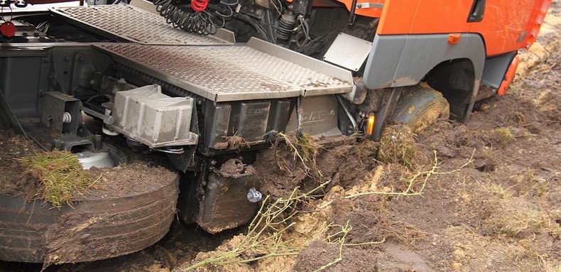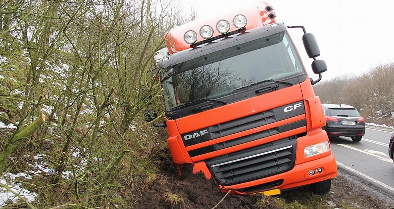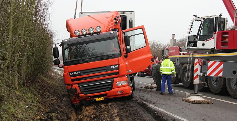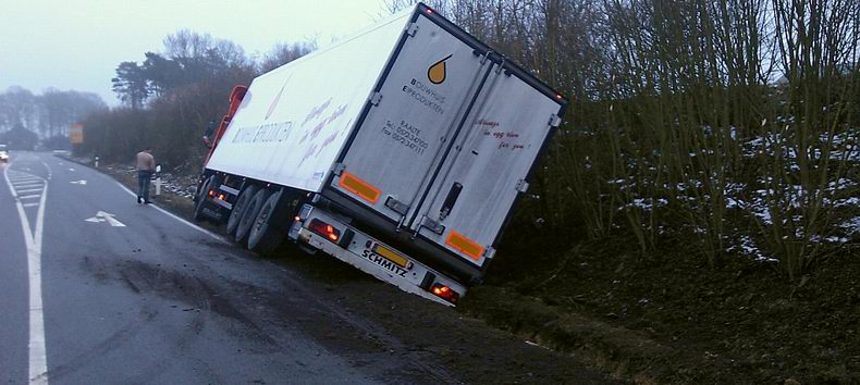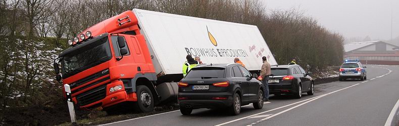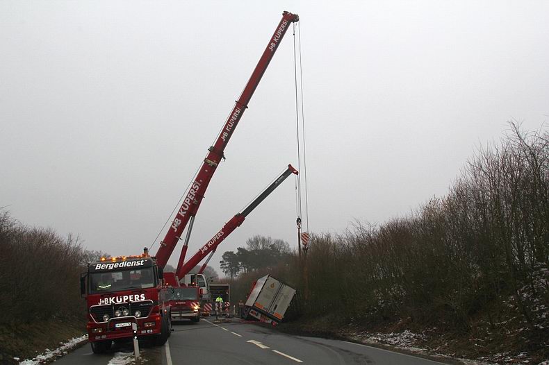 De 39-jarige trucker uit Haarle (NL) kwam met de schrik vrij. Omdat de oplegger vol lading zat, kwamen er twee telekranen van de firma Küpers uit Osterwald (D) aan te pas om de combinatie op de weg te zetten Om de berging veilig te kunnen vrrichten, werd de rondweg afgezet, hoewel sommige verkeersdeelnemers toch langs de ongevalslokatie trachtten te komen. De vrachtwagencombinatie kon na de berging zijn terugweg naar Nederland aanvaarden. |