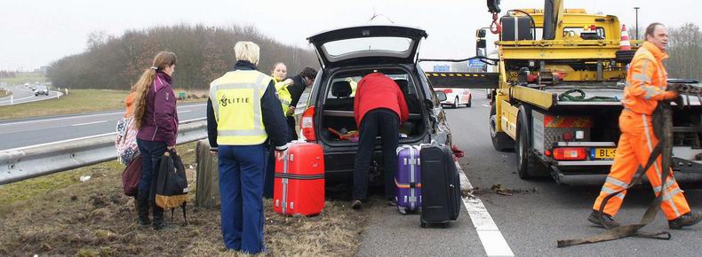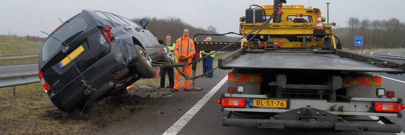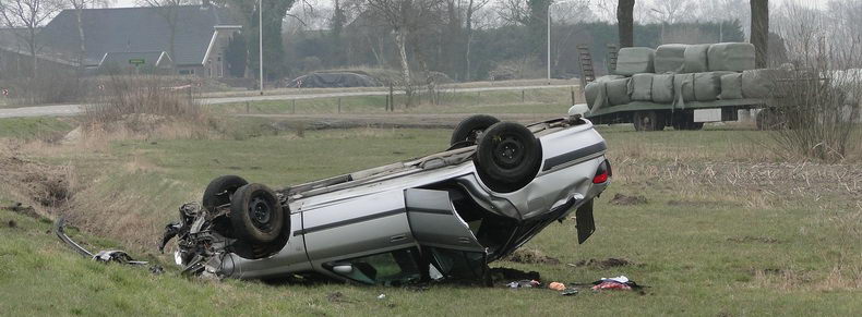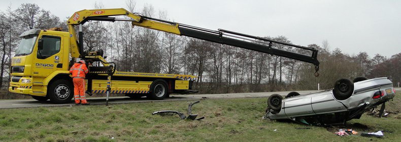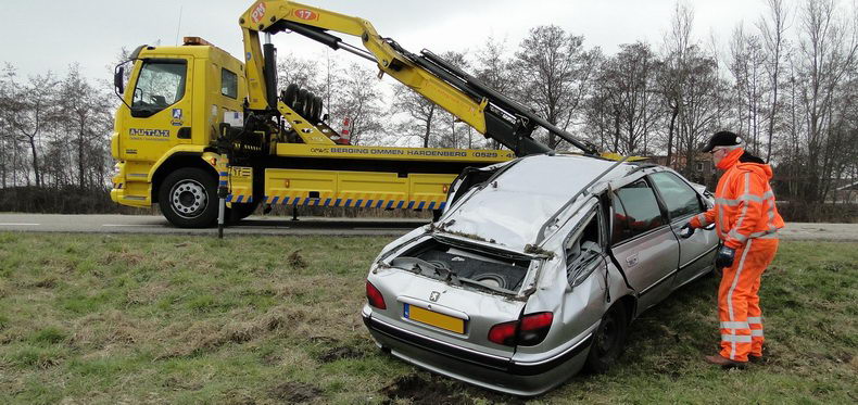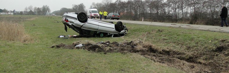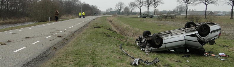 | Twee inzittenden van een Peugeot 406 Break kregen de schrik van hun leven, toen ze over het Ommerkanaal Oost richting Ommen reden en de auto in de bocht ter hoogte van de Grensweg in de berm belandde. De bestuurder - een inwoner van Dedemsvaart- probeerde met de beruchte ruk aan het stuur weer op de rijbaan te komen, maar bereikte het tegendeel: de auto begon hevig te slingeren, slipte dwars de weg over, gleed de linker berm in en ging hard over de kop, na een slootwal geraakt te hebben. Naar het zich liet aanzien bleef het letsel beperkt tot nekpijn bij de bstuurder, die per ambulance naar een ziekenhuis is vervoerd. Twee verkeersongevallenanalisten onderzochten de sporen grondig, ten behoeve van het proces verbaal. Daarna kon berger Autax het wrak ophalen en kon de weg rond half vijf weer opengesteld worden. |