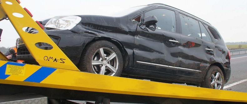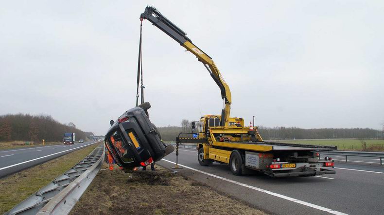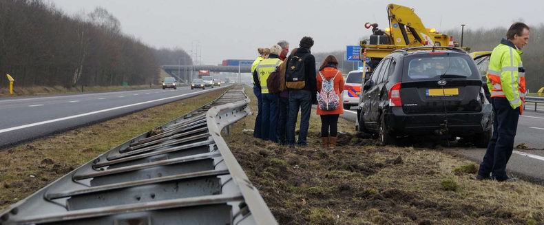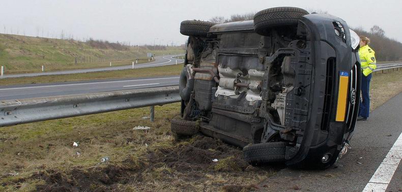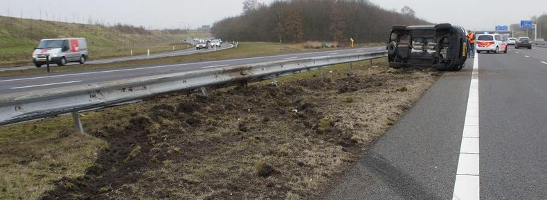 | Op de A28 bij het Knooppunt Hoogeveen, is een auto met vier inzittenden in de vangrail gereden en daarbij op de zijkant terecht gekomen. De bestuurder van de Kia Carens (bouwjaar 2008), geraakte op de rechtervluchtstrook en raakte daar bijna de vangrail. Hij reageerde met een ruk aan het stuur, waardoor de auto met een gang naar de vangrail naar de linkerkant in de middenberm reed. In de zachte berm schoof de auto langs de vangrail en viel tenslotte op zijn kant. Geen van de vier inzittenden liep letsel op. Ze konden het voertuig zonder hulp verlaten. Het opgroepen brandweer- en ambulancepersoneel hoefde niet in actie te komen. |