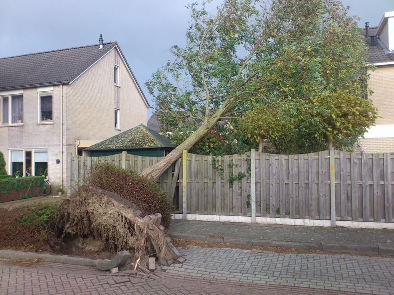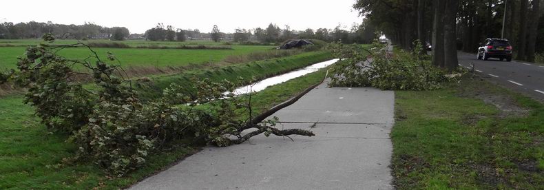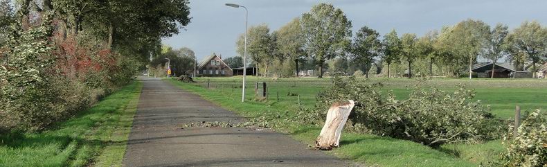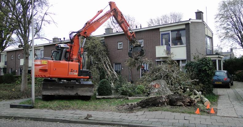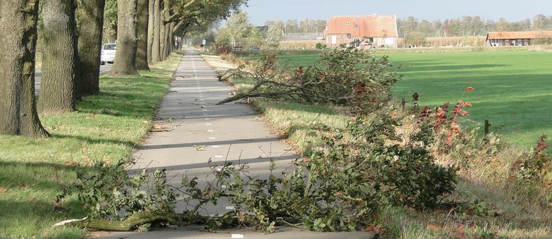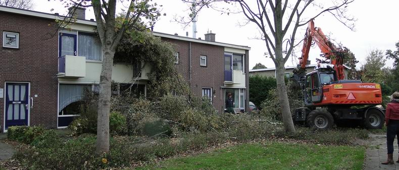 | Ook in Coevorden sneuvelden de nodige bomen en kwamen takken naar beneden; vaak, zoals in dit geval aan de Acacia, doordat de wortels te weinig konden uitdijen of afgesneden waren ten gevolge van (het leggen van) bestrating. De bomen vielen dan ook doorgaans van de straat af. Een belangrijk leermoment...! |