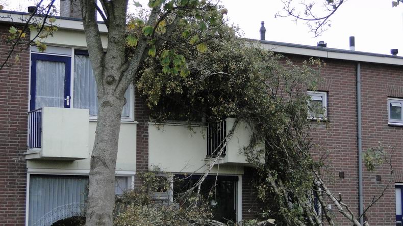 Er vielen gelukkig geen slachtoffers, maar de schrik, die een omvallende berk de bewoonster van een hoekwoning bezorgde, was er niet minder om. De boom, waarvoor al een kapvergunning was afgegeven, viel rakelings voor de woning langs en bleef deels hangen op het balkon van de buren, dat daardoor schade opliep. |