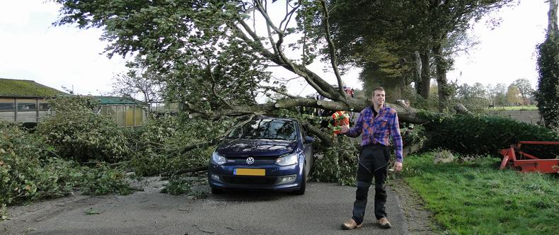 | Een ritje van een paar honderd meter naar de Kosseweg met zijn vader's auto om even een onderdeeltje voor z'n auto op te halen, zal een inwoner van Schuinesloot nog lang heugen. Niet voor een kleintje vervaard wildede jonge man tijdens de vliegende storm met het gevonden onderdeeltje terug naar de plaats van vertrek, maar inmiddels was er even verderop een flinke tak van een boom gewaaid: tijd om het obstakel even per GSM te melden. Wat de Schuinesloter alleen niet verwachtte, gebeurde een ogenblik later: met krakend geweld denderde er een complete eik op Pa's Polo; pal achter de bestuurder ! Wonder boven wonder kon de man ongedeerd uitstappen; sterker nog: zelfs zijn zonnige humeur was niet kapot te krijgen, dus: tijd voor een foto bij de gedeukte Polo met een vrolijke thumbs up voor de Kilroy-camera. De blusgroep van De Krim verwijderde de gesneuvelde boom vakkundig door 'm met de knetterbijl in openhaardhout om te toveren. De schade aan de twee jaar oude Polo leek nog mee vallen; zeker gezien het gewicht van de eik. |